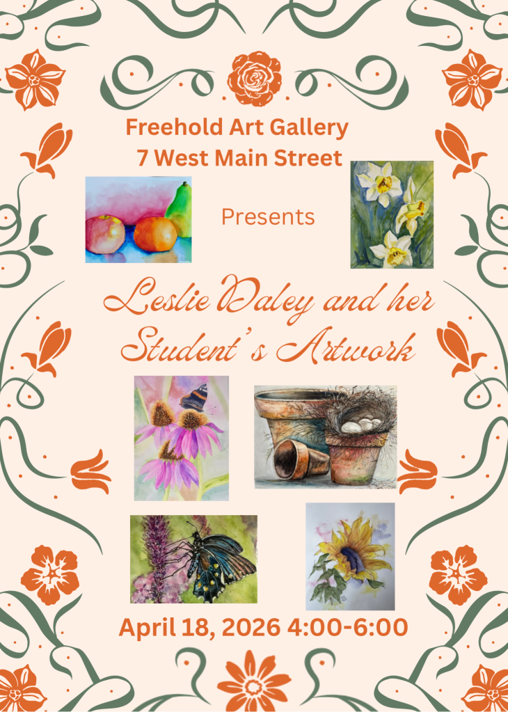 Join FAS President Leslie Daley and students from her Watercolor class at the opening of their exciting new show at Freehold Art Gallery, April 18, 4-6pm. Show runs for six weeks!